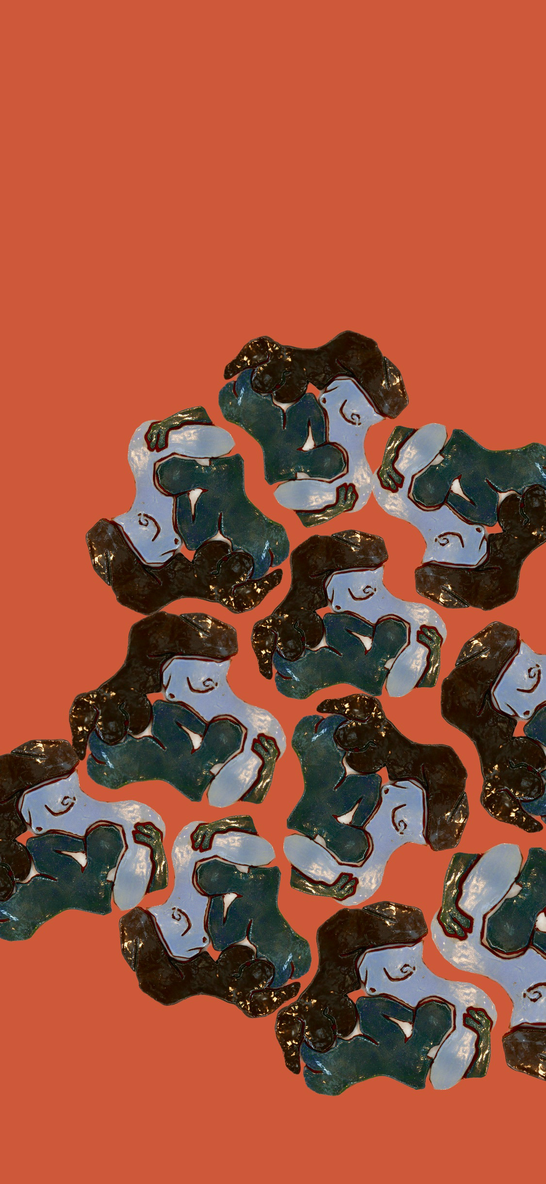 What started as an idea for a rug, a flat human on the ground, evolved into a variety of pattern designs for interior tiles. The initial idea was the question if people would react differently to a fake flat human rug as to an actual animal skin. Then the design became less gruesome and more playful, and eventually a dry sexual. The human drawings were forced into squares and hexagons, distorting the proportions of body parts. Then I tried to make the tiles interact with each other, this became the orgy tiles and the people holding each other up inspired by puzzle pieces. When the tiles are placed, a grout in a complementary earthy colour would be used to fill in the gaps and emphasise the designs.