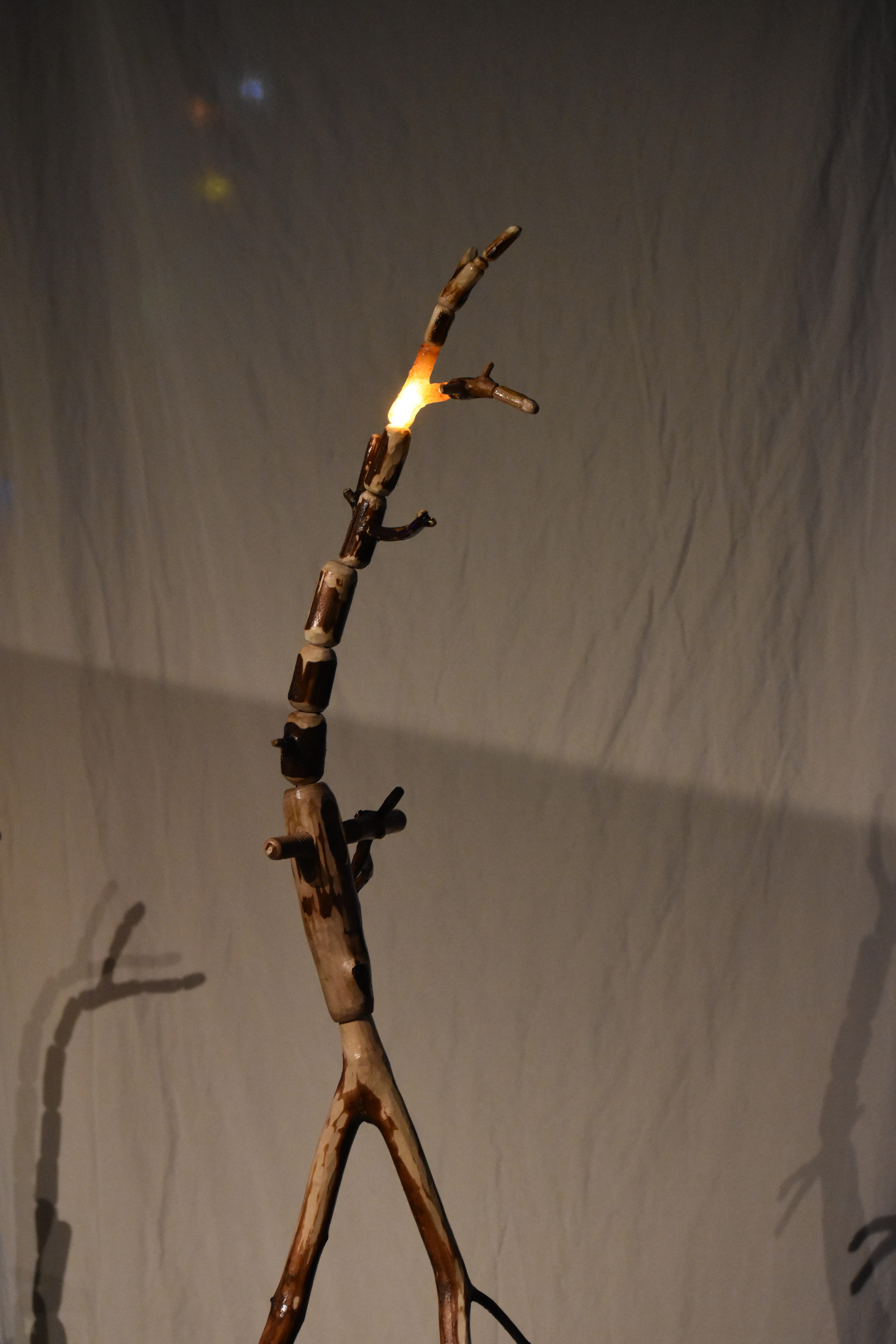 This playful movement and interaction gives the piece a whimsical character. The lamp is made of tree trimmings, some of them are carved, some left with the bark on. The light is coated with pine resin which gives it an interesting texture and a warm glow.